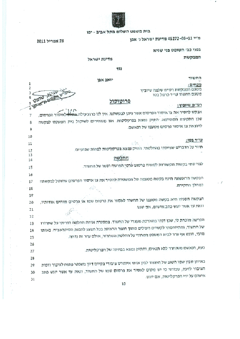 The blog also published the gag order extension (page 1 and page 2) issued by Judge Beni Sagi on April 28th. I posted about the judge’s initial ruling approving the gag here. Among the other pearls of wisdom in the April 28th ruling is the following: